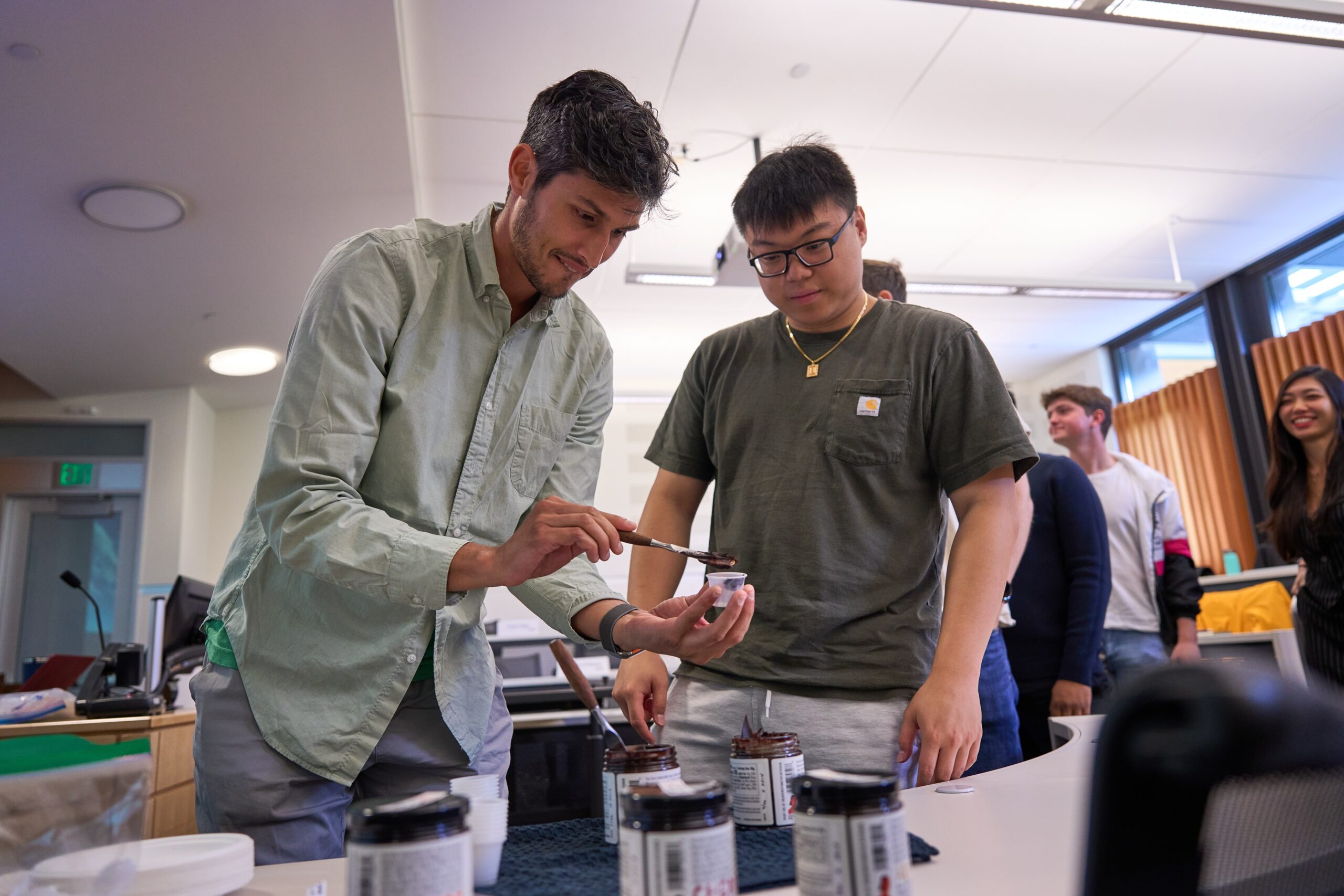 Betsy Sperry leads a discussion on brand strategy, followed by chocolate sauce tasting, with students in the Master of Science in Entrepreneurship program at the UW Foster School of Business.