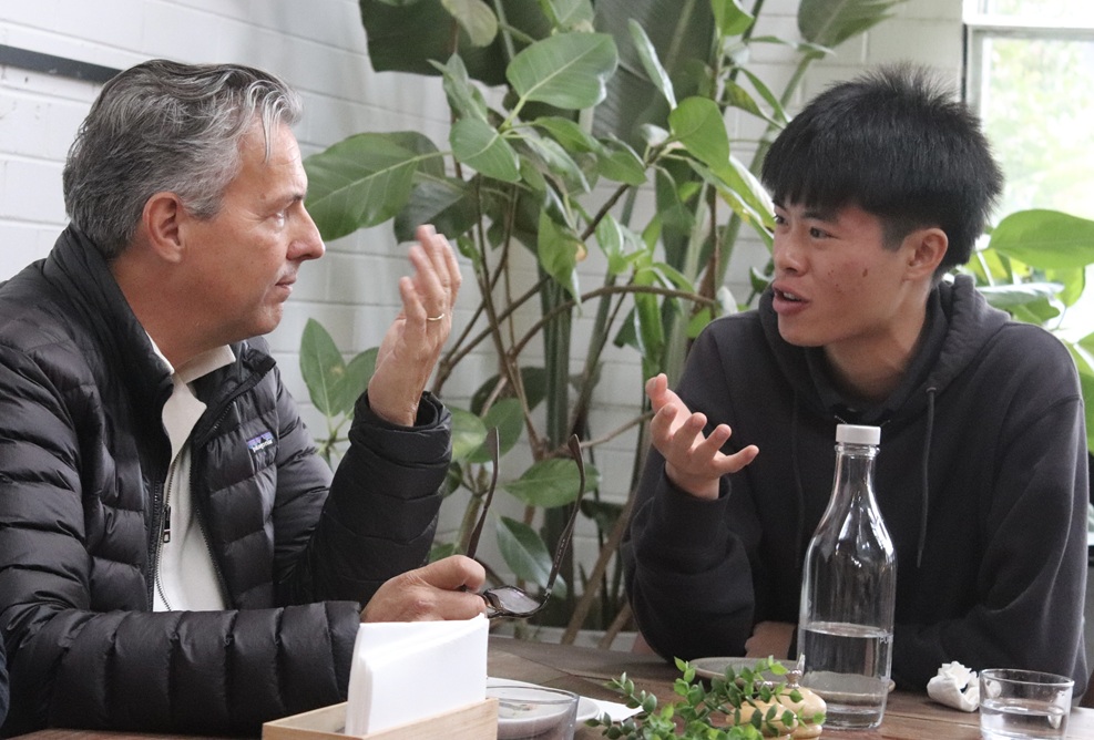 Foster student Aaron Ton (right) talks all things sports with Martin Schlegel, Director of the Australian Sports Technology Network, which collaborates with the UW Consulting Association for Australian startups.