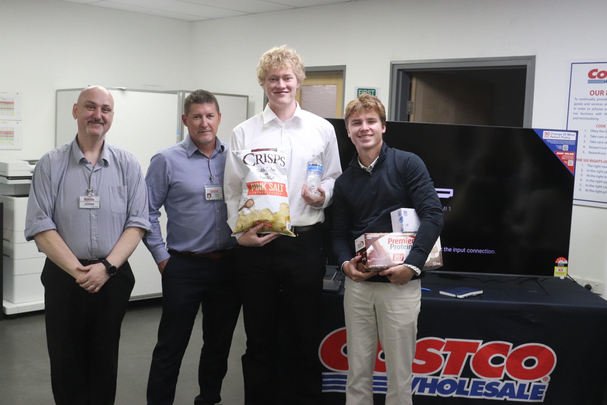 From left, John Angelkov, Costco store director; Chris Tingman, Director of Costco Australia Operations; Foster students Henry Stickel and Connor Kirk